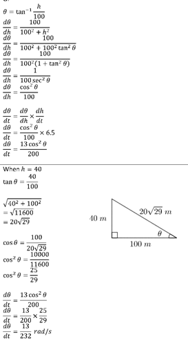 a. If θ radians is the angle of elevation of the lift from the observer, show that $$\frac{{d\theta }}{{dt}}$$ = $$\frac{{13{{\cos }^2}\theta }}{{200}}$$.