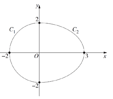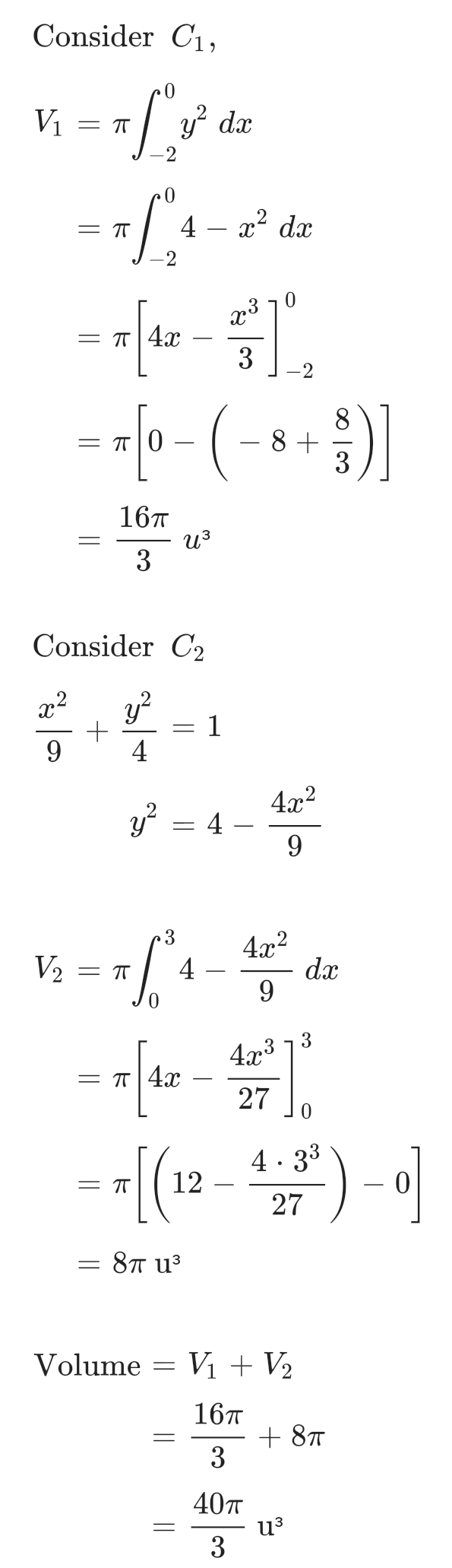 The diagram shows two curves C1 and C2. The curve C1 is the semi-circle x2 + y2 = 4 for –2 ≤ x ≤ 0. The curve C2 is the ellipse for 0 ≤ x ≤ 3. An egg is modelled by rotating the curves about the x-axis to form a solid of revolution. Find the exact value of the volume of the solid of revolution.