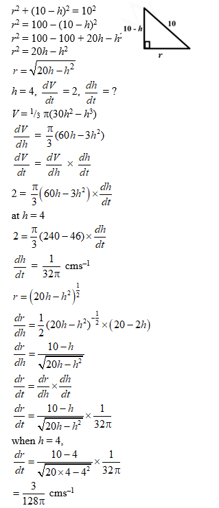 = $$\frac{{ – 40}}{{{r^3}}}$$$$\frac{{dr}}{{dt}}$$ = -2 $$\frac{{dh}}{{dt}}$$ = ??? when r = 4 cm